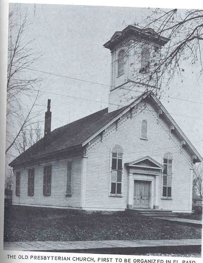 Pictured at left, probably held the earliest organized church services in our community, as they were meeting on a more or less regular schedule in the Mohr settlement northwest of El Paso in the early 1850's. Reverend Hoffman was the pastor, and all of the meetings were held in private homes. In 1864, when the Reverend Shoemaker was pastor, the congregation decided to build a church in El Paso. George L. Gibson gave them a lot on the northwest corner of Second and Pine Streets where the P. J. Roth home stands and they purchased another lot next west of it for $100.